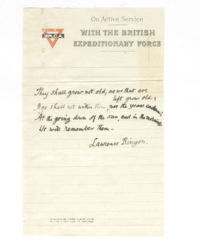 They shall grow not old as we that are left grow old. They shall grow not old as we that are left grow old. At the going down of the sun and in the morning We will remember them. They shall grow not old as we that are left grow old.